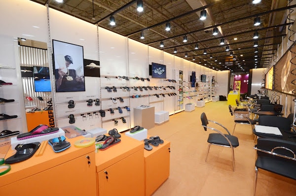 A iluminação é ajustada estrategicamente para valorizar o estande e reforçar a identidade da marca.